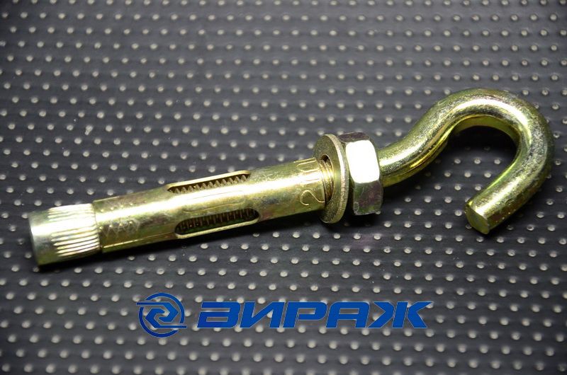 Болт анкерный с крюком - это резьбовая шпилька, на одном конце которой открытый крюк, а на другом - цанга (распорный элемент). Шпилька помещена в гильзу (внешняя оболочка болта). Анкерный болт с крюком изготавливается из желтопассивированной стали.Болт анкерный с крюком необходим в том случае, когда нужно закрепить тяжёлые съёмные конструкции. Это может быть и временное крепление такелажных изделий: цепи, тросы и т.п. крепление анкерных болтов с крюком осуществляется к таким полнотелым материалам, как бетон, кирпич или природный камень.
