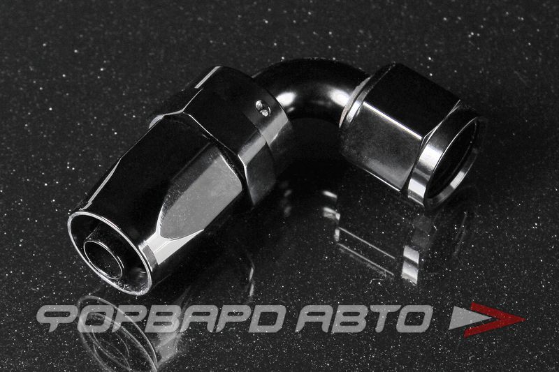 Фитинг соединительный, переходной под углом в 90 градусов. С одного конца фитинга гайка с внутренней резьбой AN8, с другого - муфта обжимающая, предназначенная для присоединения шланга AN8. Цвет - анодированный чёрный .