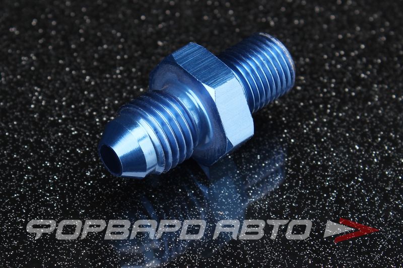 Фитинг прямой переходной с резьбы AN4 (Dвн = 4 мм.) на резьбу М10*1,0. Внутренний диаметр фитинга составляет 4 мм. Изменение диаметров происходит за счёт плавного сужения отверстия. Материал – сплав алюминия, цвет синий (получен в результате анодирования металла).