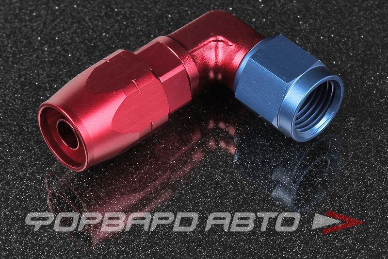 Фитинг соединительный, усиленный под углом в 90 градусов. С одного конца фитинга гайка с внутренней резьбой AN6, с другого - муфта обжимающая, предназначенная для присоединения шланга AN6. Цвет - синий с красным.