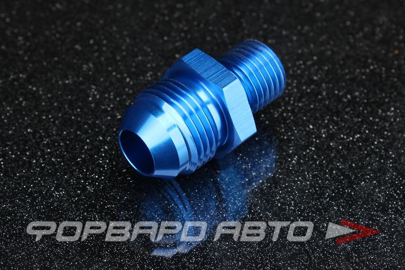 Фитинг прямой переходной с резьбы AN8 (Dвн = 10 мм.) на резьбу М14*1,5. Внутренний диаметр фитинга составляет 7 мм, на всей длине фитинга внутренний диаметр отверстия - не изменяется. Материал – сплав алюминия, цвет синий (получен в результате анодирования металла).