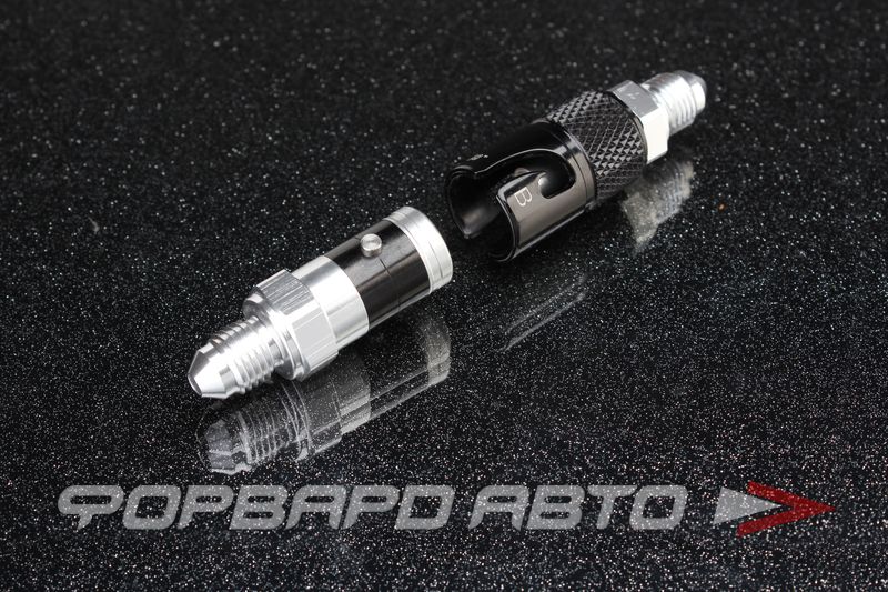 Фитинг - быстроразъёмное соединение. С обеих сторон соединения вкручены фитинги с резьбой AN3 с наименьшим проходным диаметром 3 мм. Соединение происходит за счёт шпонки и паза. Внутри фитинга присутствует пружина для прижатия друг к другу обеих частей БРС. Материал - алюминий, цвет - комбинированный (чёрный и металлический)