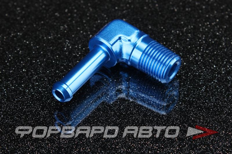 Фитинг соединительный переходной под углом в 90 градусов. С одного конца фитинга нарезана резьба 1/8", с другого - трубка, предназначенная для присоединения шланга с минимальным диаметром 6 мм к фитингу. Герметичность соединения достигается за счёт уменьшения зазора между витками резьбы. Цвет - синий.