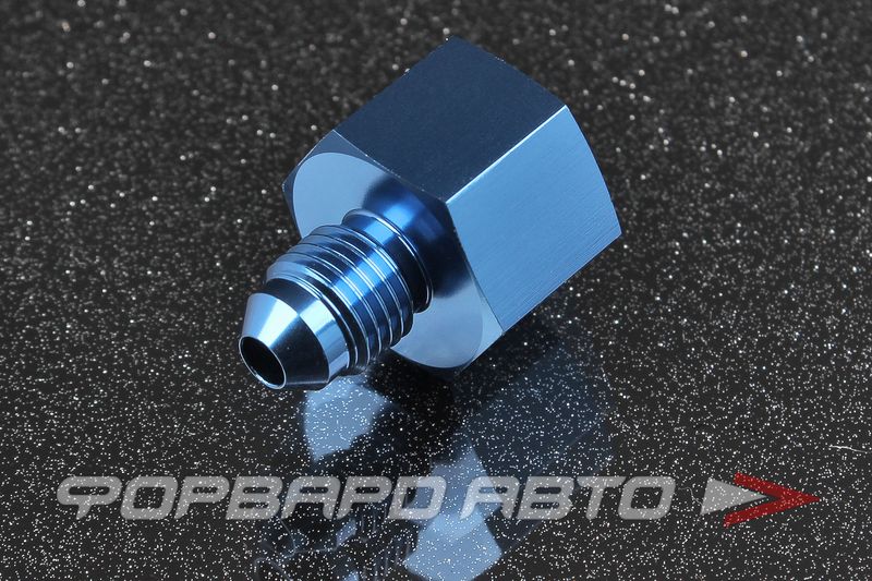 Фитинг прямой переходной с резьбы AN6 (Dвн = 7 мм, внутренняя) на резьбу AN4 (Dвн = 4 мм, наружная резьба). Переход с диаметра на диаметр осуществляется посредством плавного сужения отверстия. Герметичность соединения происходит за счёт конусности соединяемых деталей. Материал фитинга - алюминий, цвет - синий (получен с помощью анодирования металла).