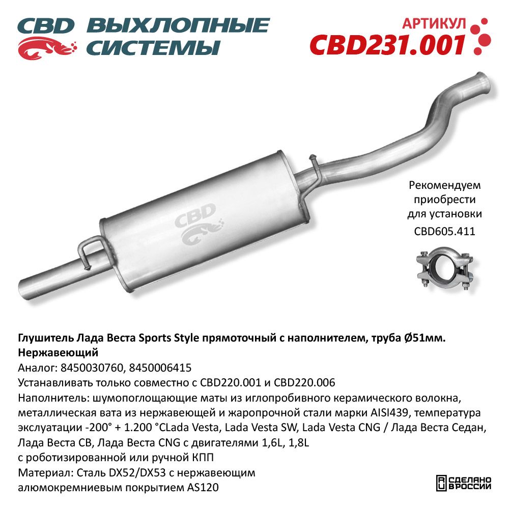 Описание: глушитель прямоточный с наполнителем, изготовленный из нержавеющей стали. Модель CBD231.001 предназначена для автомобилей Лада Веста Sports Style.