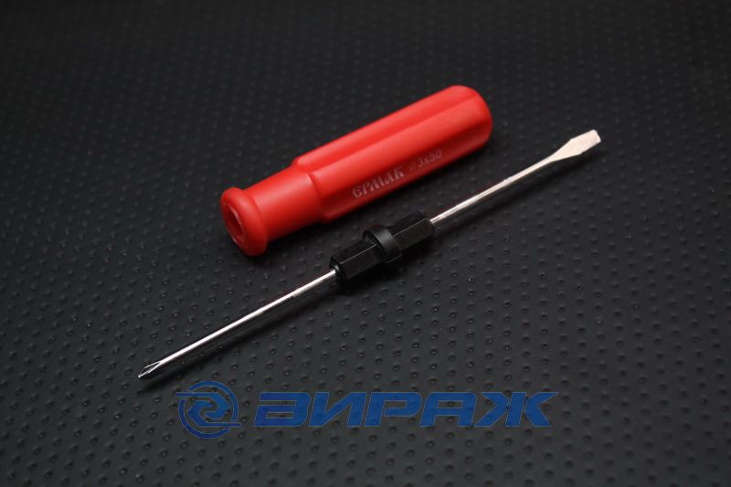 Отвертка имеет двухсторонний наконечник, который позволяет использовать ее как для работы с плоскими, так и для работы с крестовыми шлицами. Размер наконечника составляет 3*50мм, что позволяет использовать инструмент для работы с небольшими деталями и механизмами.