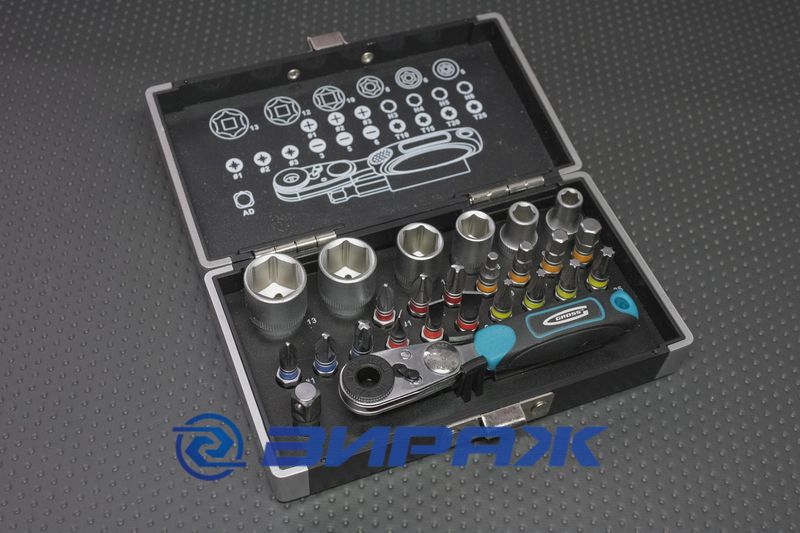 Храповой механизм набора (52–зубная трещотка) снабжен эргономичной двухкомпонентной рукояткой, которая удобно располагается в руке и не выскальзывает во время наибольшего крутящего момента.