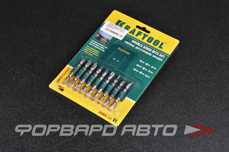Двухсторонние биты в наборе Kraftool 26060-H10 применяются с ручными отвертками для работ по монтажу/демонтажу крепежа, имеющего шлиц PH, PZ или SL.