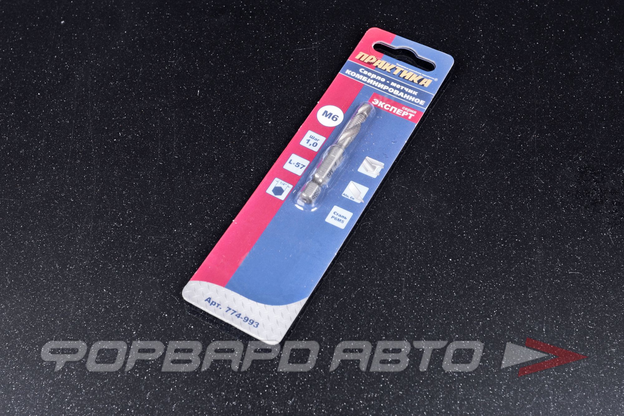 Сверло метчик ПРАКТИКА М6 шаг 1ммСверло метчик комбинированное предназначено для сверления отверстия и нарезания резьбы при помощи дрели. Для обработки легированных и не легированных сталей с порогом прочности на растяжение 800Н/мм2 ковкого чугуна и цветных металлов изготовленно из быстрорежущей стали Р6М5, шлифованное, нитрид-титановое покрытие, хвостовик Hex 1/4". Сверление, нарезание резьбы, зенковка производится за один рабочий проход. Очистка резьбы на обратном ходу. Резьба метрическая правосторонняя.