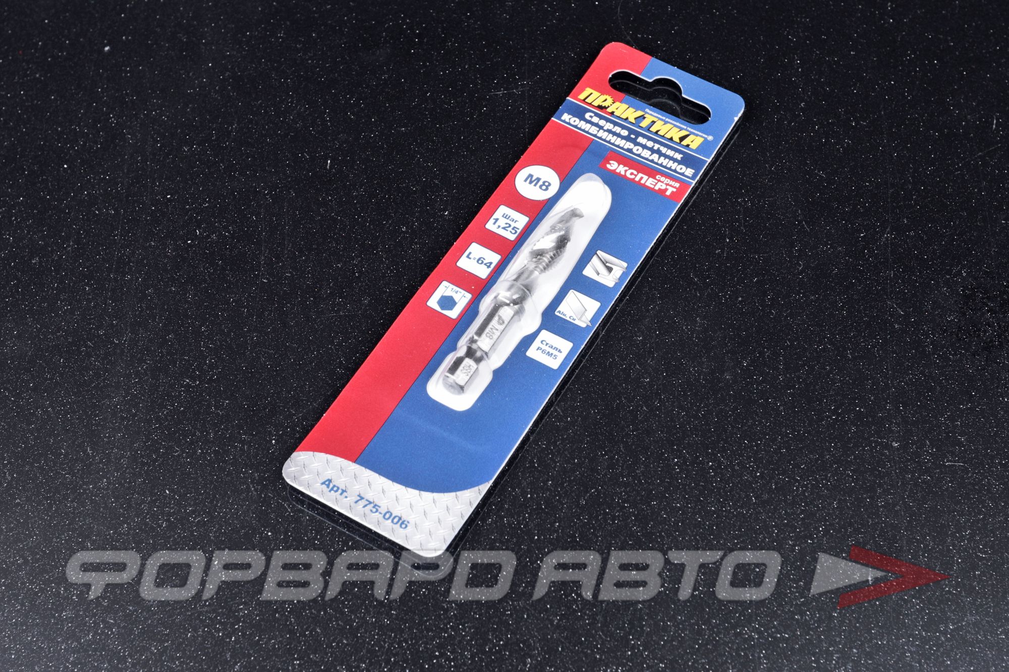 Сверло метчик ПРАКТИКА М8 шаг 1.25ммСверло метчик комбинированное предназначено для сверления отверстия и нарезания резьбы при помощи дрели. Для обработки легированных и не легированных сталей с порогом прочности на растяжение 800Н/мм2 ковкого чугуна и цветных металлов изготовленно из быстрорежущей стали Р6М5, шлифованное, нитрид-титановое покрытие, хвостовик Hex 1/4". Сверление, нарезание резьбы, зенковка производится за один рабочий проход. Очистка резьбы на обратном ходу. Резьба метрическая правосторонняя.