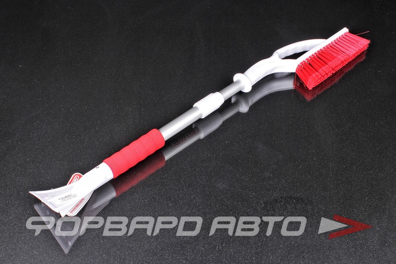 Щетина щетки распушенная, что обеспечивает максимальную эффективность уборки. Скребок на обратной стороне щетки позволяет быстро и легко очистить от снега и льда окна, крыши автомобиля и другие поверхности.
